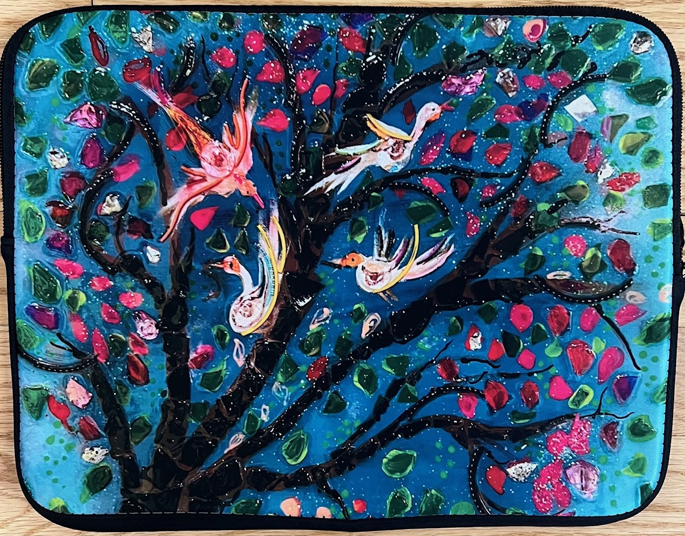 The artist has created a dynamic fusion where art and design merge . Here it is seen in her sample collection.